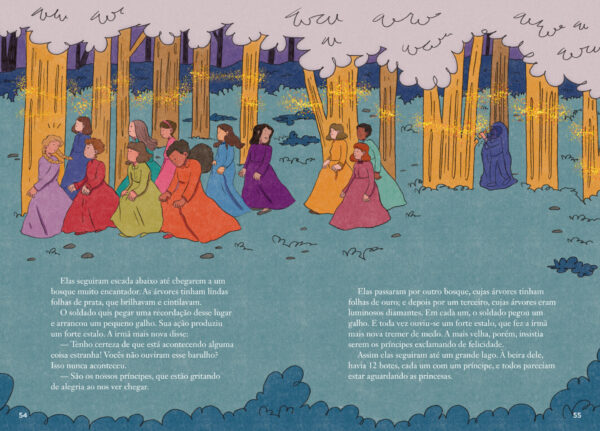 "O rei então anunciou por toda parte que, se alguém desvendasse o segredo, se descobrisse onde as princesas dançavam à noite, poderia escolher uma delas para se casar e se tornaria o futuro rei."